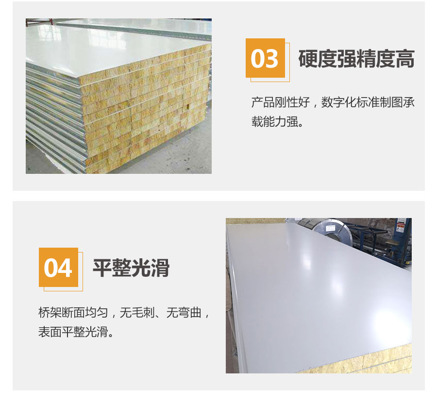 3、保溫隔熱性好:巖棉夾芯板的導(dǎo)熱系數(shù)為0.044W/㎡K,可達(dá)到高效保溫,可用作保溫板,隔熱板。